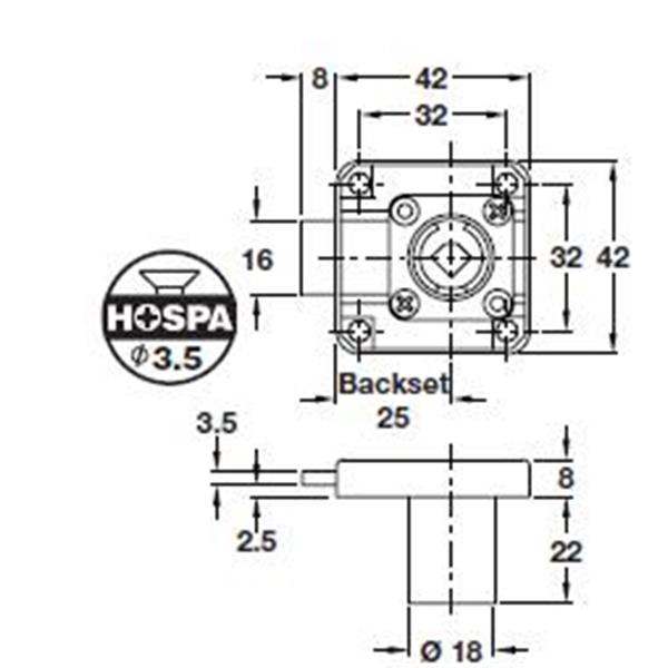 Ohišje pohištvene ključavnice Hafele 232.26.600 je dimenzije 42 x 42 mm, premer cilindra ključavnice je 18 mm. Dolžina cilindra je 22 mm in je predvidoma namenjena za iveral debeline 18 ali 19 mm. Ključavnico se privijači z ivernimi vijaki debeline 3.5 mm. Cilinder je odmaknjen od konca ključavnice 25 mm. Poleg ohišja je potrebno dokupiti cilinder (2x ključ) in zunanjo rozeto. Pri tej ključavnici se ključ za zaklep obrne na desno.
