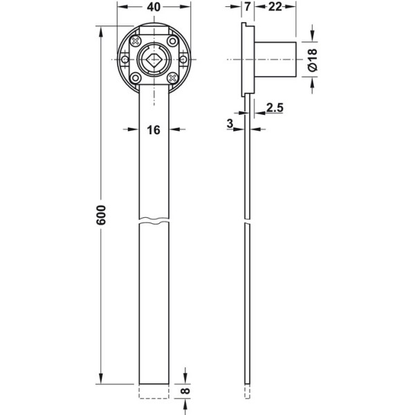 Bočna ključavnica Hafele 237.48.600 je namenjena za zaklep predalnikov. Ključavnica se zapira oziroma zmontira iz strani predalnika. Zgornji del ključavnice je premera 40 mm in ima zaklepni aluminjast drog dolg 600 mm. Hod droga je 8 mm. Premer cilindra ključavnice je 18 mm, dolžina cilindra pa je 22 mm. K tej ključavnici je treba dokupiti še zaklepni zatič, cilinder, rozeto in vodilo letve.