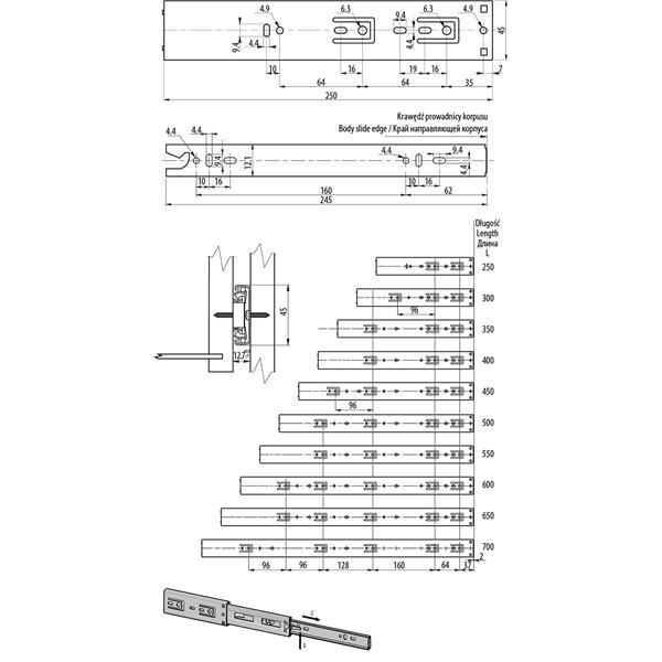 GTV kroglična vodila za predale so trenutno eden najboljših krogličnih vodil, ki so na voljo na trgu. Mehanizem delovanja krogličnih vodil temelji na trpežnih, jeklenih kroglicah, ki se premikajo po profilih. Kot nalašč za vse vrste predalov in za izvlečne police. Primerno za predale v mehaničnih delavnicah. Predstavljena GTV kroglična vodila zagotavljajo visoko kakovost in dolgo življenjsko dobo. Širina vodila je 45 mm. Dolžina vodila 250 mm. Nosilnost krogličnih vodil je 35 kg na par. Kroglično vodilo za predale GTV se iztegne 100 %.