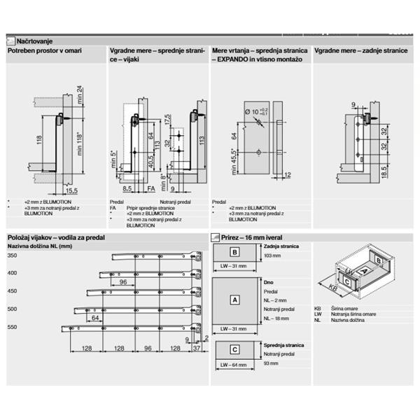 Vodila za predale Blum metabox dolžine 450 mm in višina stranice 120 mm